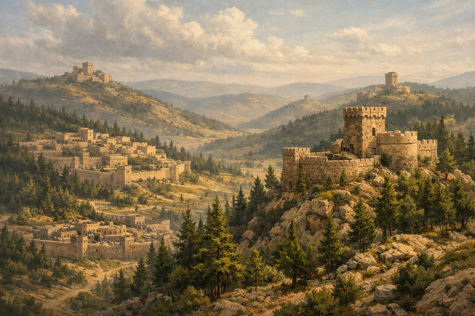 2 Chronicles 27:4 Moreover, he built cities in the hill country of Judah, and he built fortresses and towers on the wooded hills. |