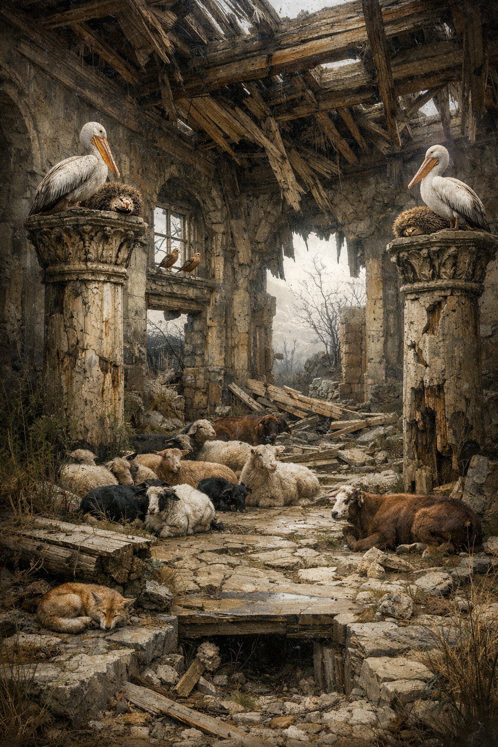 Zephaniah 2:14 Flocks will lie down in her midst, All beasts which range in herds; Both the pelican and the hedgehog Will lodge in the tops of her pillars; Birds will sing in the window, Desolation will be on the threshold; For He has laid bare the cedar work.