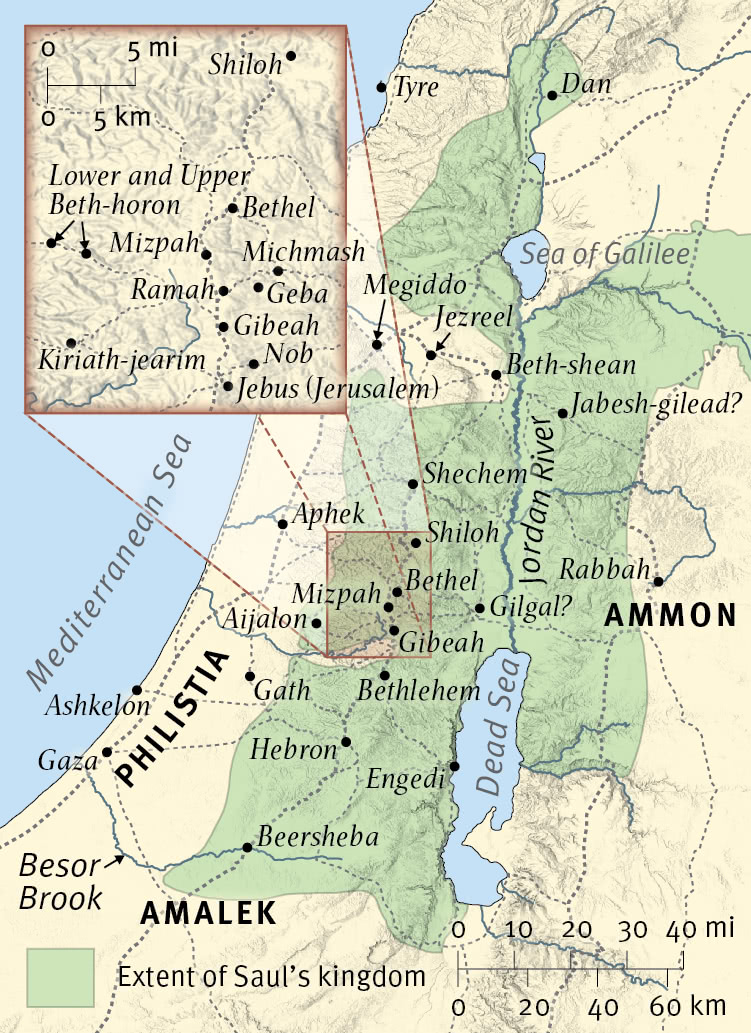 Saul (asked, desired) was forty years old when he began to reign, and reigned forty two years over Israel - Here is the incredible rendering of the RSV = "Saul was...years old when he began to reign; and he reigned....and two years over Israel!" Almost all scholars agree that the numbers have dropped out in the course of transmitting this verse! The translation of this verse is problematic and the Septuagint even leaves it untranslated. Even the ESV is difficult to understand. The age of Saul at the time he began his reign is not certain, some versions inserting 30 and some 40, which expresses the uncertainty even by the experts! The length of his reign is undoubtedly 40 years (or some versions say "42"), because of the statement by Stephen in Acts 13:21 (see above).