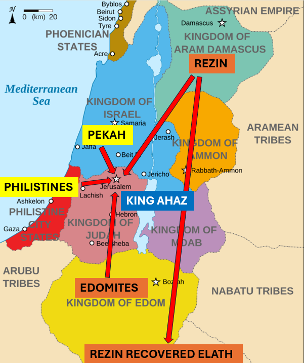 John Olley: The dramatic developments affecting Judah that eventuated during Ahaz’s sixteen-year reign (2Ch28) are for the Chronicler the result of Ahaz’s unfaithfulness (2Ch 28:1–5, 19). An attack by the alliance of Syria and Israel brought some devastation to Judah (2Ch 28:5–8), and a weakened Judah was then attacked by Philistines and Edomites; Ahaz sought help from Assyria, which demanded tribute (2Ch 28:16–21). Ahaz’s apostasy increased, even to shutting the doors of the temple (2Ch 28:22–27). (SEE ESV Expository Commentary Volume 3: 1 Samuel–2 Chronicles)