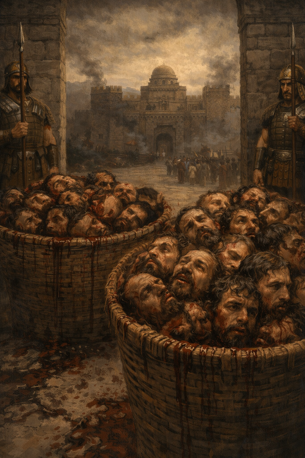 2 Kings 10:8 When the messenger came and told him, saying, “They have brought the heads of the king’s sons,” he said, “Put them in two heaps at the entrance of the gate until morning.”