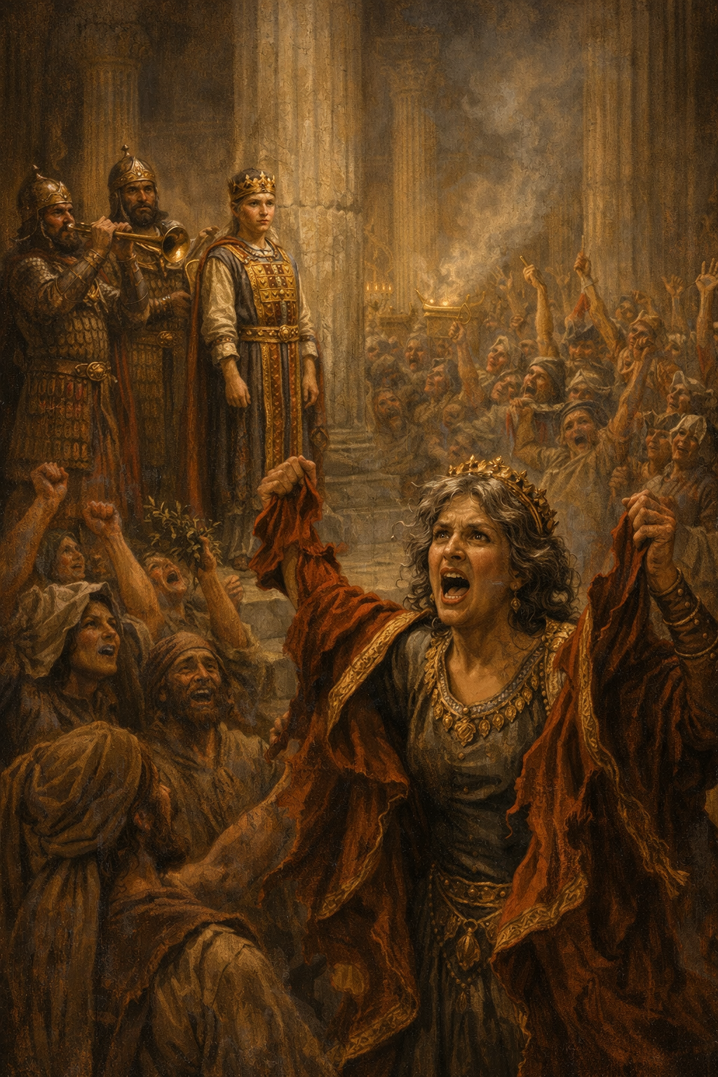 When Athaliah unexpectedly heard the tumult, and the acclamations, she was greatly disturbed in her mind; and suddenly issued out of the royal palace with her own army: and when she was come to the temple, the Priests received her: but as for those that stood round about the temple, as they were ordered by the High Priest to do, they hindred the armed men that followed her from going in. But when Athaliah saw the child standing upon a pillar, with the royal crown upon his head, she rent her clothes, and cried out vehemently, and commanded [her guards] to kill him that had laid snares for her, and endeavoured to deprive her of the government. But Jehoiada called for the captains of hundreds, and commanded them to bring Athaliah to the valley of Cedron, and slay her there: for he would not have the temple defiled with the punishments of this pernicious woman. And he gave order, that if any one came near to help her, he should be slain also. Wherefore those that had the charge of her slaughter took hold of her, and led her to the gate of the King’s mules, and slew her there.