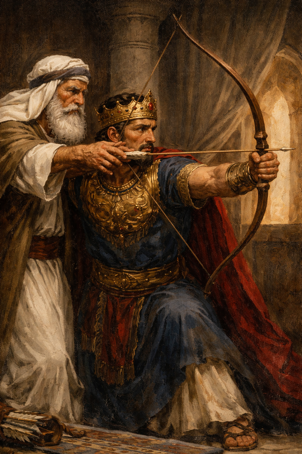 Second Kings records another of Joash of Israel’s military victories. When Joash’s father, Jehoahaz, was reigning, King Hazael of Aram (the same king that Joash of Judah had kept from attacking Jerusalem) oppressed Israel (2 Kings 13:22). “But the Lord was gracious to them and had compassion and showed concern for them because of his covenant with Abraham, Isaac and Jacob. To this day he has been unwilling to destroy them or banish them from his presence” (2 Kings 13:23). When the prophet Elisha was sick and near to death, King Joash of Israel visited the prophet, apparently disconcerted over the military situation in Israel (2 Kings 13:14). Elisha instructed Joash to shoot arrows out of the open window. The prophet then proclaimed, “The Lord’s arrow of victory, the arrow of victory over Aram! . . . You will completely destroy the Arameans at Aphek” (2 Kings 13:17). Elisha next instructed Joash to strike the ground with the arrows. Joash did so but stopped after three strikes. “The man of God was angry with him and said, ‘You should have struck the ground five or six times; then you would have defeated Aram and completely destroyed it. But now you will defeat it only three times’” (2 Kings 13:19). When Hazael died and his son, Ben-hadad, took over, Joash did defeat him three times. Israel was able to recover cities that previously had been taken from them (2 Kings 13:24–25).