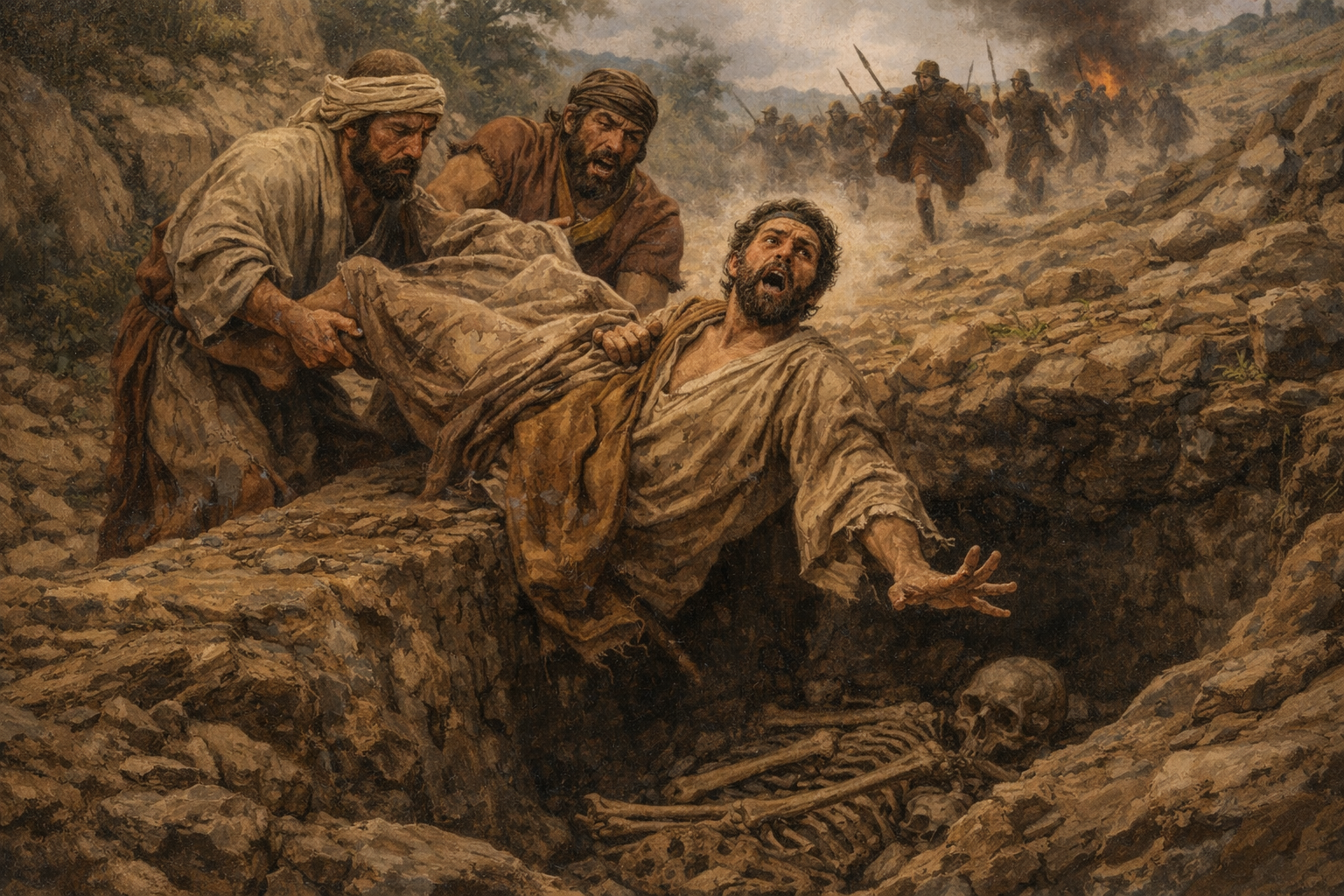 Let us imagine ourselves standing within the burial-ground. We behold a funeral procession approaching—one of those, which are every moment and uninterruptedly traversing the earth. An Israelite is being carried to his long home; probably one of the quiet in the land, who did not bow the knee to Baal. But he must have been a poor man, for there was no hewn sepulcher in readiness to receive him; on the contrary, the grave had still to be dug for him. But the moment the attendants are about to commence the work, spears and swords are seen glittering in the distance. A troop of Moabites is on the march towards them. What is now to be done? They cannot continue their work without imminent danger of their lives, or exposing themselves to the risk of a dreadful imprisonment. Close at hand is Elisha’s tomb; and without reflecting long, they quickly roll away the stone from its mouth, and cast the corpse, for the time, on the bones of the prophet. But what is the result? Oh, what a miracle! No sooner does the corpse touch his remains, than the departed spirit returns to it. The man raises himself up, stands upon his feet, and, oh! the surprise and astonishment of the funeral attendants! he issues forth from the tomb alive!