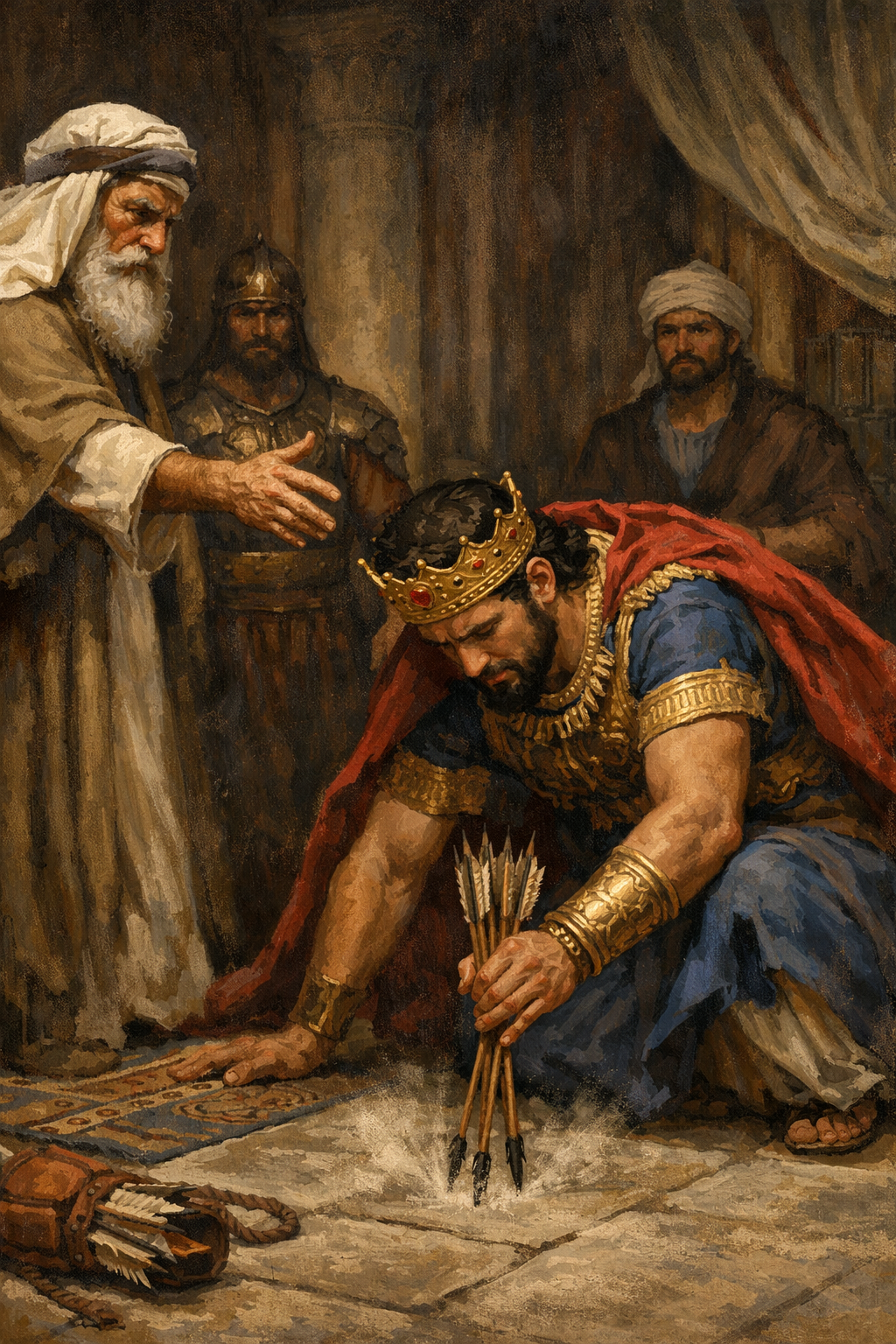 2 Kings 13:18-19+  Then he said, “Take the arrows,” and he took them. And he said to the king of Israel, “Strike the ground,” and he struck it three times and stopped. 19 So the man of God was angry with him and said, “You should have struck five or six times, then you would have struck Aram until you would have destroyed it. But now you shall strike Aram only three times.”