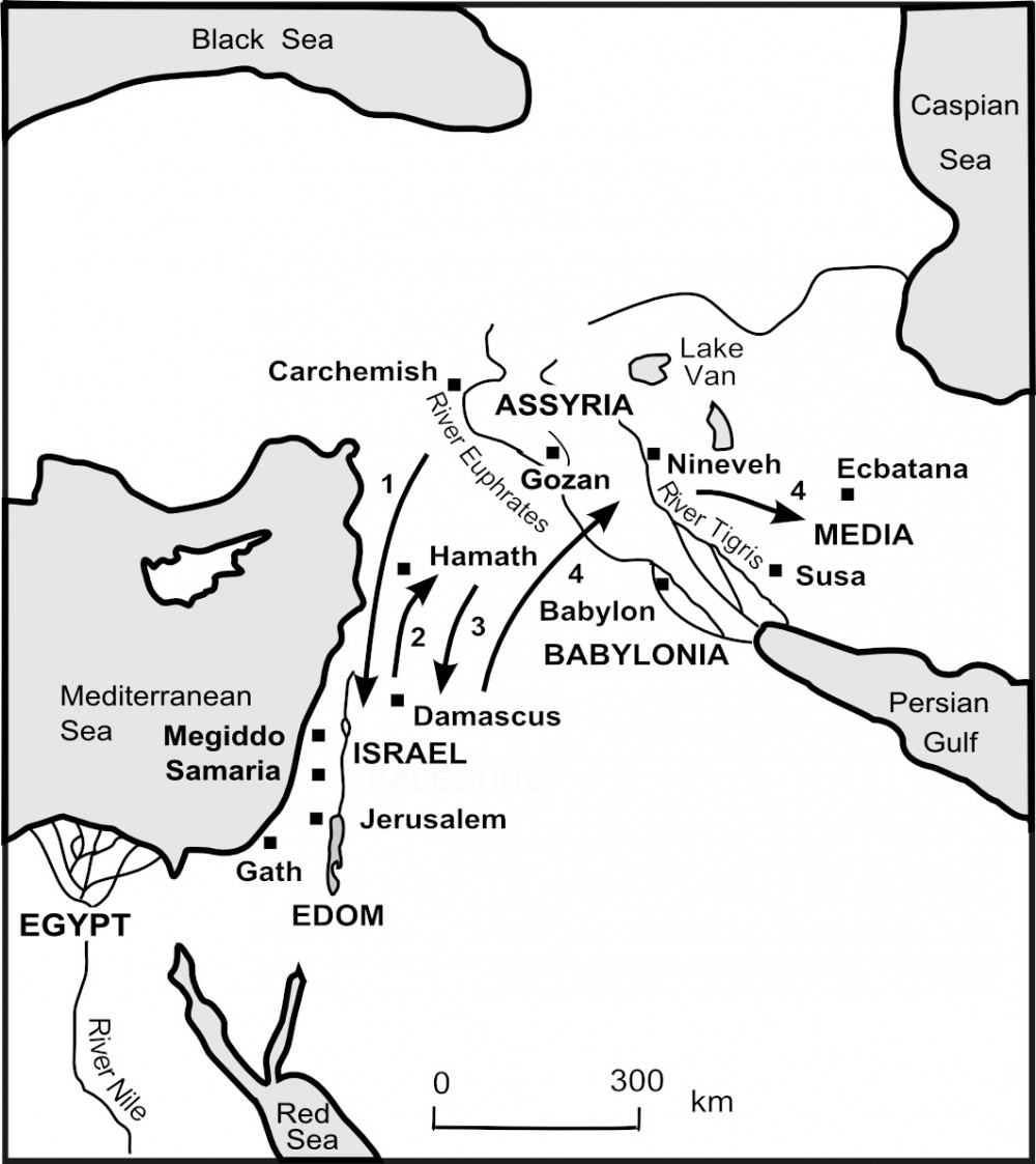 Politically, the natural place to which Ahaz might turn for help was, of course, Assyria, with its huge military resources and suzerainty over the area. Ahaz sent to the emperor Tiglath-Pileser III (given his Babylonian name Pul in 2 Kgs 15:19), who needed no encouragement to come to restore order in his western dominions. In 734 he came from the north down the sea coast and subdued the Philistines as far as the Egyptian border, and a few months later attacked Israel, taking much territory. All of Israel’s lands across the Jordan were conquered, as was Galilee, the huge fortified cities of Hazor and Megiddo being destroyed. Large numbers were deported (15:29), and Pekah himself was murdered in a conspiracy, to be succeeded by his murderer, Hoshea ben Elah, who promptly sued for peace. Tiglath-Pileser claims to have had a hand in this (“They overthrew their king Pekah and I placed Hoshea as king over them”). Tribute was paid, and the following year Damascus was attacked and conquered, and Rezin was slain. The population was deported, after the Assyrian custom, and taken to Kir, whence some of their ancestors had once migrated (Amos 9:7). Judah was now safe, though this had been achieved at the price both of a considerable payment (2 Kgs 16:8) from temple funds and of her political freedom.
