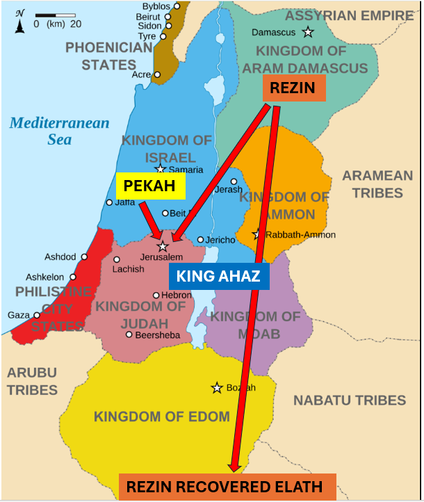 King Rezin of Aram and King Pekah of Israel had besieged King Ahaz’s lands, and, although they were not strong enough to defeat Ahaz, they did “inflict heavy casualties on him” (2 Chronicles 28:5+). Not only were Ahaz’s son Maaseiah and his second-in-command, Elkanah, killed, but over 100,000 soldiers were killed, and Judah’s cities were plundered. Many Israelites who were living in Judah were taken captive (verses 6–8). Because of all this, Ahaz appealed to the king of Assyria, Tiglath-Pileser, for help in defeating Aram and Israel. Tiglath-Pileser complied and attacked Damascus, capturing the city and killing King Rezin.