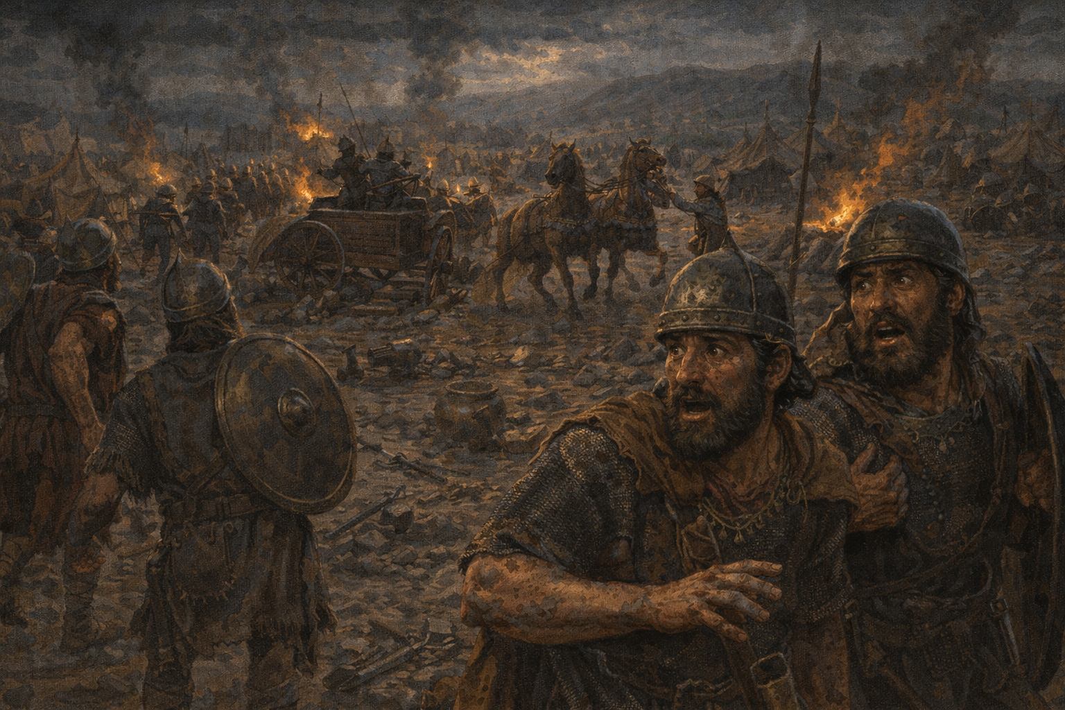 They took therefore two chariots with horses, and the king sent after the army of the Arameans, saying, “Go and see. - The officer had asked for 5 horses but the king let him only have 2 chariots (with probably 2 horses per chariot). The king of Israel had enough sense to finally authorize a cautious scouting mission to verify the "good news" of the four lepers. The chariots would provide speed and give the scouting party some defense. It would also allow them to follow the trail to the Jordan River (2Ki 7:15). In effect, we see the beginning of God's promise unfolding.