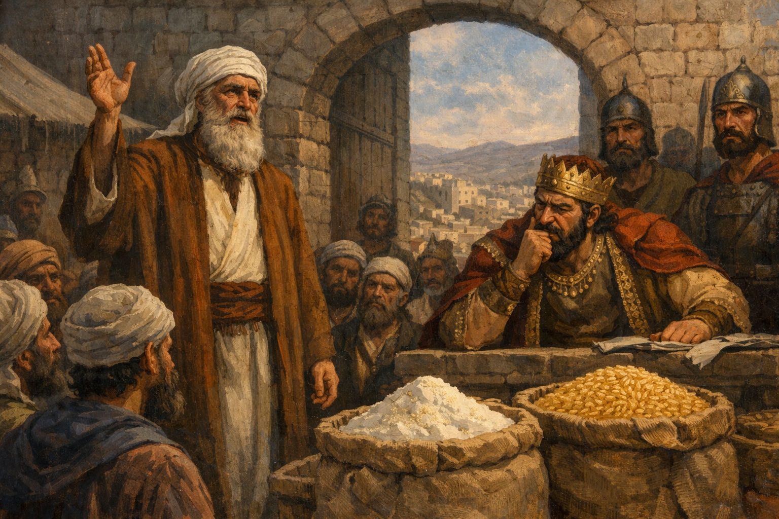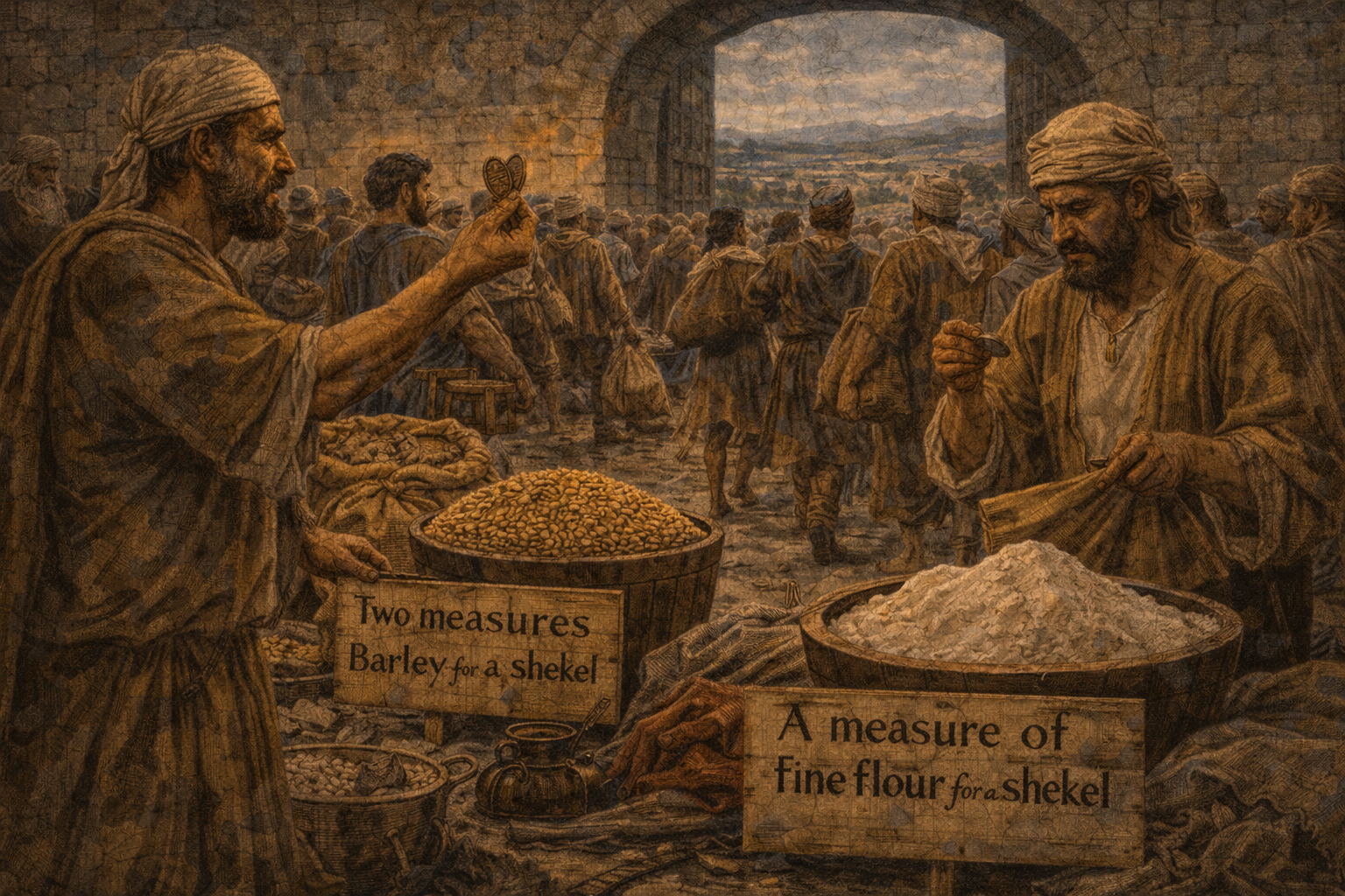 Tomorrow about this time a measure of fine flour will be sold for a shekel, and two measures of barley for a shekel, in the gate of Samaria - Within 24 hours (tomorrow about this time), food would be abundant and cheap, right in Samaria’s marketplace. These are slightly higher thannormal prices but low enough that it would allow the famine to cease and normal life to resume instantly with abundance replacing starvation overnight. What a miraculous turnaround! Siege-induced "inflation" had resulted in donkey heads selling for 80 shekels and dove's dung for 5 shekels! With only His Word, God creates dramatic divine "deflation"! This is a testimony to the power of Jehovah which is shown to the northern kingdom which has been worshiping Baal, a so-called "god" of fertility! Yahweh is the true Source of fertility! One wonders if any of the idol worshipers saw the Light of God and were converted? We will have to wait until we are in heaven to know as the text does not tell us.