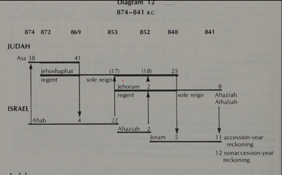 Constable: There were two King Ahaziahs as there were two King Jehorams, one of each in each kingdom. Both Ahaziahs reigned only one year each, but their administrations did not overlap. The administrations of the two Jehorams did overlap. Ahaziah of Israel reigned 11 years earlier than Ahaziah of Judah. In Judah, Jehoram (853-841 B.C) preceded Ahaziah (841 B.C.), but in Israel Ahaziah (853-852 B.C.) preceded Jehoram (852-841 B.C.). Ahab had two sons, Ahaziah and J(eh)oram, who reigned successively in Israel; Jehoshaphat had a son, Jehoram, and a grandson, Ahaziah, who reigned successively in Judah.