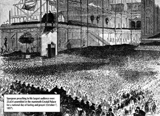 The period of Spurgeon’s early London ministry was a period of considerable economic and social distress in Britain. Cholera was a great scourge: Twenty thousand died in 1854, Spurgeon’s first year in London. Also in that year, the Crimean War broke out, the first war involving the major European powers since Waterloo. The mutiny of the Seypoys in India in 1857 provoked a tremendous outpouring of rage and grief, concluding in a National Day of Fast and Humiliation during which Spurgeon addressed the largest audience of his life: twenty-four thousand gathered in the Crystal Palace. These events, with the economic disruptions caused by the outbreak of the American Civil War, brought suffering and economic ruin to many, who sought religious solace in confused and troubled times. Not coincidentally, the 1850s ended with the “Great Revival,” which began in Ireland and Scotland and swept into England, igniting religious emotions in a fashion not seen in Britain since the days of Wesley and Whitefield. Spurgeon disdained the title of “revivalist,” but his ministry clearly benefited from the religious enthusiasm sparked by the events of 1859.