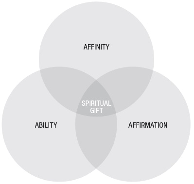 The circle labeled “ability” refers to what you are naturally good at; “affinity” to what you feel passionate about; and “affirmation” to ways people have testified that God has used you. Where all three circles converge is typically an indication of a spiritual gift. Often, spiritual gifts coincide with natural abilities you already have. God takes a natural talent and “supercharges” it for his purposes. For example, my gift of exhortation coincides with a natural ability I have for coaching, public speaking, and persuasion. Evidently, Paul was a great thinker and leader before he became a Christian, having been selected to apprentice under the highly respected Jewish leader Gamaliel (Acts 22:3). His special calling as an apostle and teacher coincided with his natural abilities to think and lead and write. There are exceptions, of course. Sometimes, God gives spiritual gifts that have little to do with natural abilities, in part to highlight that power in ministry comes from God, not from our talents. For example, I know a young woman in our church who is terribly shy around people, yet God has given her an unusual ability in evangelism. It makes no sense. But watching how effectively she brings other people to Jesus directs your attention away from her abilities to the God who is using her. On the flip side, I know some great orators who just can’t preach God’s Word effectively, even though they know and understand it well. It kind of baffles me. I also know selfish, materialistic people who, upon their conversion, became the most generous, giving people in our church. (Think Zacchaeus; he went from unscrupulous tax collector to a guy who joyfully gave half his income to the poor!) I know of several great preachers who had terrible stage fright when God called them to preach. As one saying goes, “Sometimes God calls those he’s gifted; other times he gifts those he’s called!”...